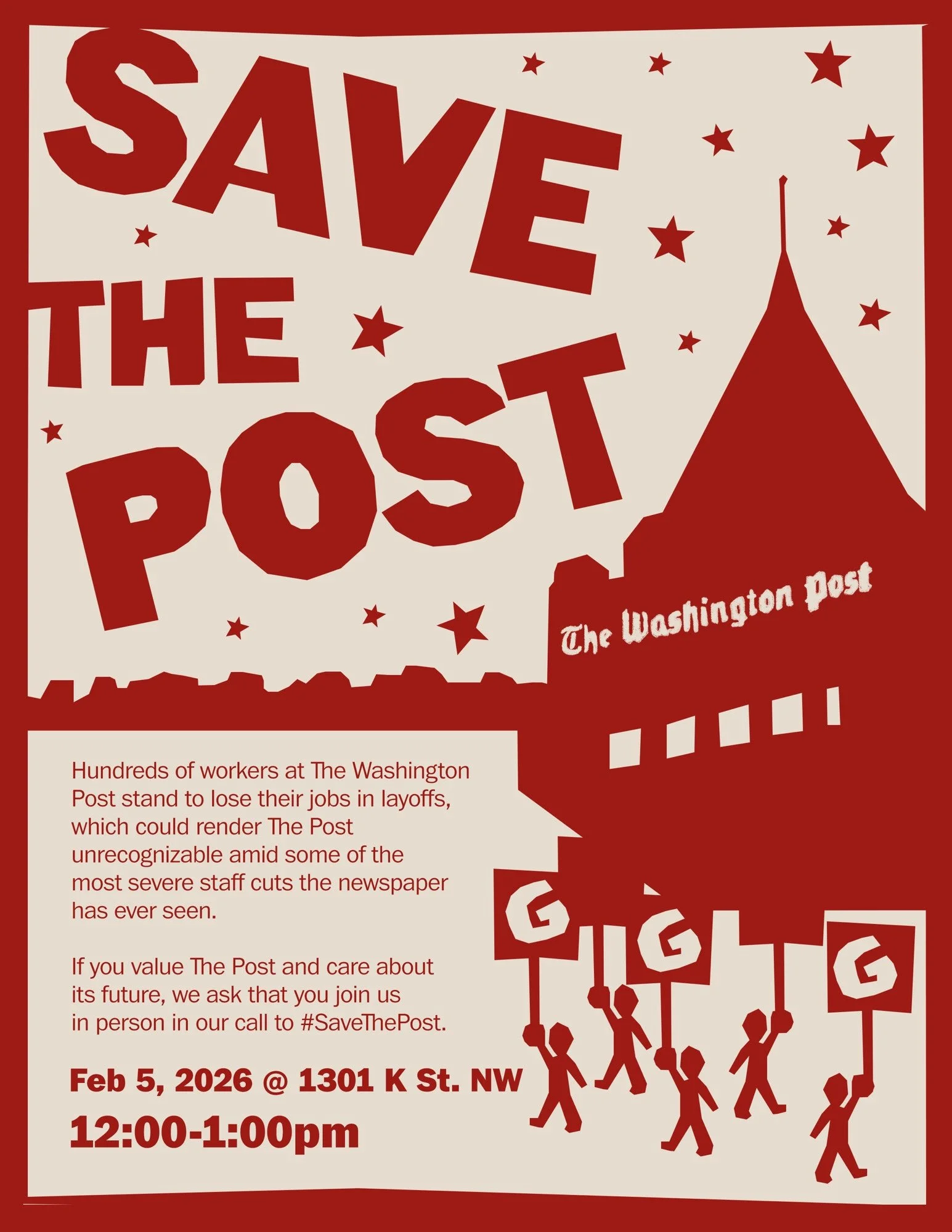 For those in D.C., you can join CWA members and community supporters for a local #SaveThePost rally on Thursday, Feb 5th at 12PM ET. The rally will be held at 1301 K St. NW (the WaPo building). Bring your friends and a pair of hand-warmers!
